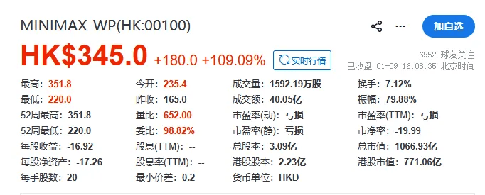 1月9日,AI大模型公司MiniMax正式在港交所挂牌,发行价165港元,开盘价直接跳到了235.4港元,收盘定格在345港元,单日涨幅109.09%。