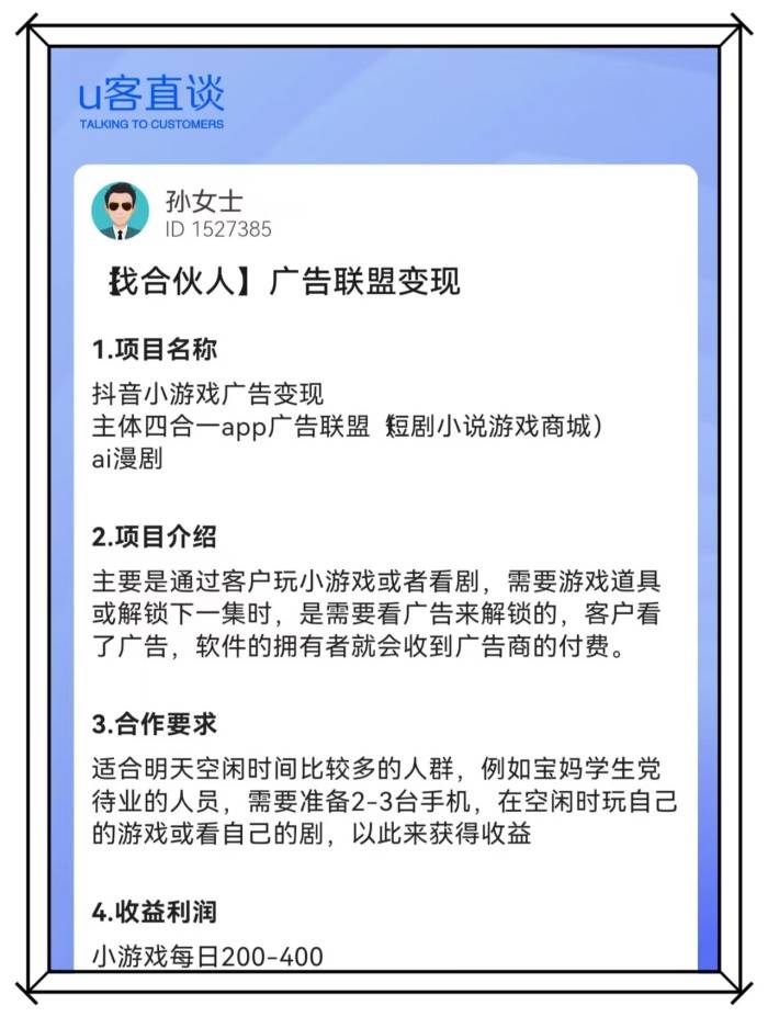 有一种思路是:直接参与游戏搭建与广告对接,减少中间分成环节。U客直谈就是一个提供广告联盟合作与游戏搭建资源的平台,你可以在这里接触项目,甚至合作开发自己的小游戏。