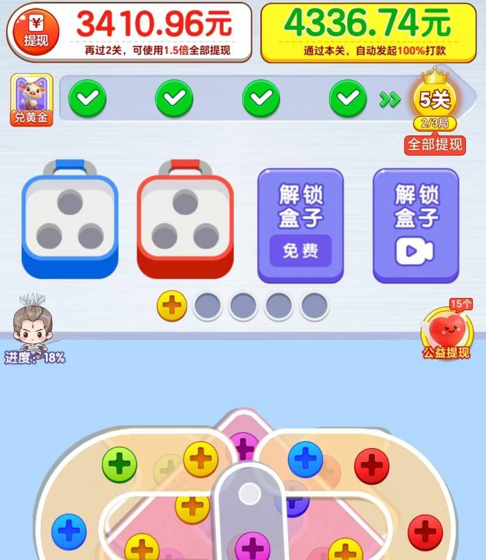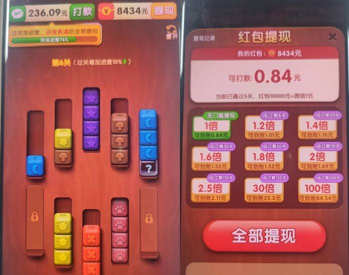 这款游戏要求将同色方块移动到同一格子内,直到所有格子颜色统一。收益机制类似上述游戏,绿色部分自动发放,红色部分满0.1元即可手动提。