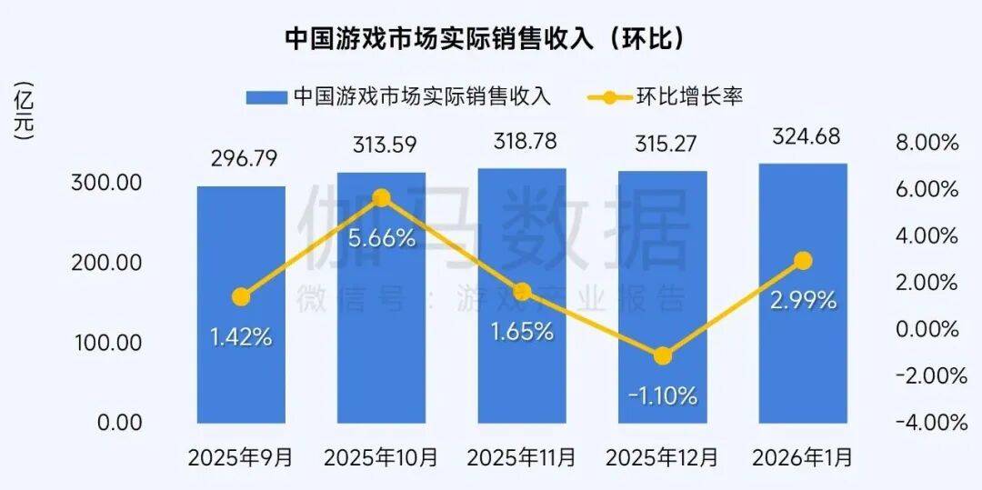 【2】2月14日,伽马数据发布了《2026年1月中国游戏产业月度报告》。数据显示,2026年1月,中国国内游戏市场实际销售收入为324.68亿元,环比增长2.99%,同比增长4.47%。