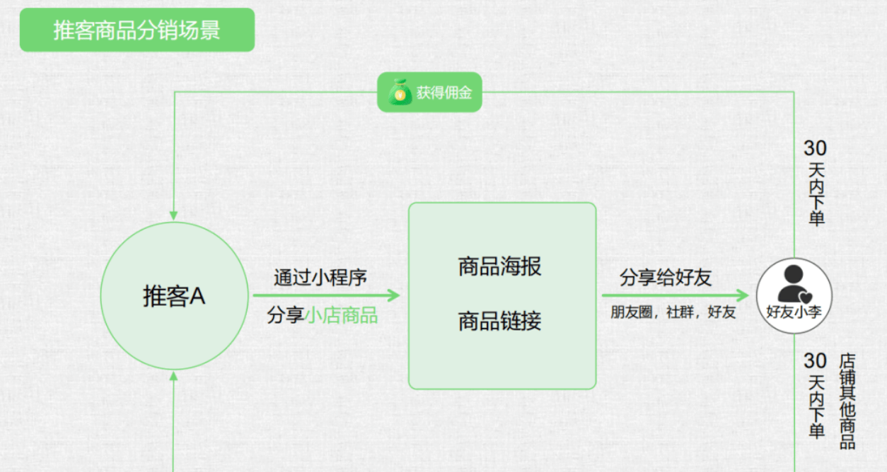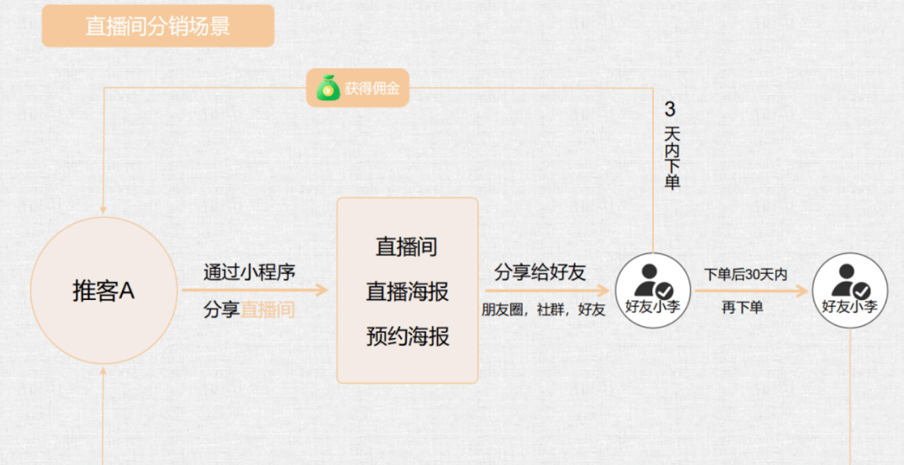 推客小李把榴莲商品链接发到小区群,好友小张点击后30天内下单100元,小李立刻收到10元佣金(10%比例)。这30天里,小张又买了2次水果,小李累计多赚15元。