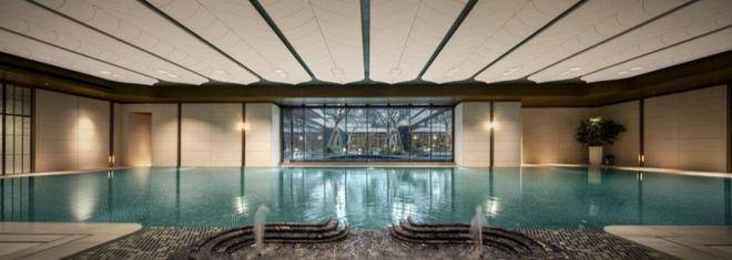 恒温泳池:第一,采用了景德镇烧制的陶瓷马赛克,独特的釉面色彩由景德镇老师傅手工浇筑而成,充满人文艺术底蕴;第二,羽毛天花造型,由600余件铝板打造,表面采用了仿贝壳纹的艺术漆处理,带来松弛度假感;第三,不仅配置了约25m×10m的4道泳池,还采用了奥运会同款空调除湿系统,彰显高档品质细节!