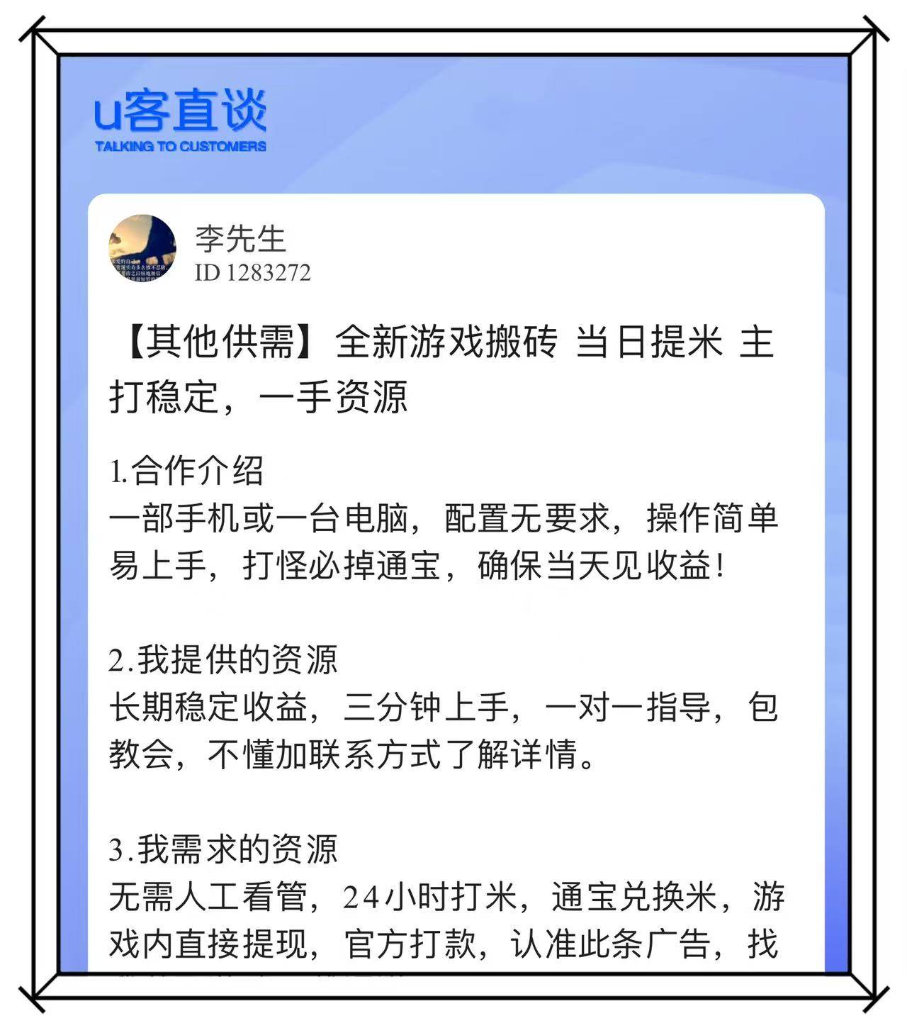 正如U客直谈商务资源对接平台数据显示,仅在该平台上,就有超过470万用户正在主动搜索和关注游戏搬砖相关的内容和机会。这个数字背后,是越来越多人对游戏变现的关注。